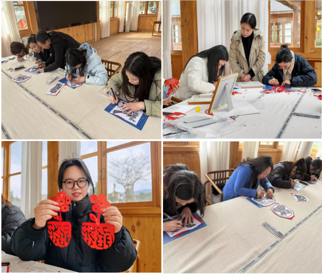 活动以“非遗课堂”拉开序幕,市国资委特邀剪纸大师李万老师进行授课,带领女职工们现场体验传统手工艺的独特魅力。他耐心细致地讲解了剪纸的历史渊源,阐述其承载的吉祥寓意和丰富的民俗风情,激发了女职工们对非遗文化的浓厚兴趣。随后,李老师从手法、线条刻画等方面指导大家开始创作,女职工们纷纷拿起刻刀,将一张张普通的红纸刻成一幅幅精美的剪纸作品,有的展现了秀丽的自然风光,有的刻画了活泼的动物形象,还有的象征着吉祥美好的寓意.....